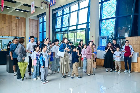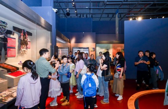 活动当天,随着传习活动的开始,参与活动的亲子团、游客跟随讲解员参观了非遗馆展示厅和布依族服饰展示区。展出的布依族服饰在灯光下熠熠生辉,每一件服饰都像是一个无声的叙述者,讲述着布依族的历史、信仰和生活方式,服饰纹样的精细做工和细腻色彩让每一位参观者都感叹于传统手工艺的精妙绝伦。