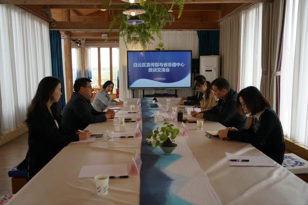 参观结束后,李泽君一行与省非遗中心进行座谈交流。座谈会上,李泽君就白云区历史、文化、文旅产业及文旅发展思路等作了交流。龙佑铭针对白云区的非遗保护现状指出,非遗保护工作是一项长期而系统的工程,要多挖掘、多申报,在增加非遗的可见度及可及性的同时要保持文化多样性、真实性与完整性,真正做到遗产丰富、氛围浓厚、特色鲜明、民众受益,不断增强各民族对非遗的认同,对优秀传统文化认同,铸牢中华民族共同体意识。