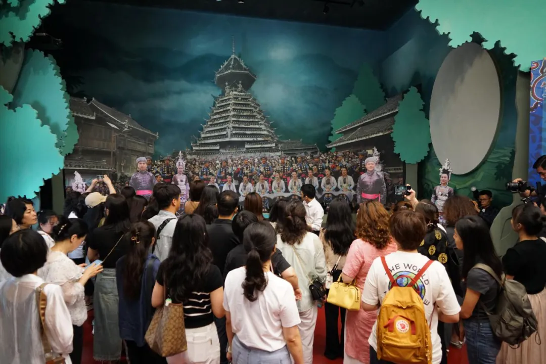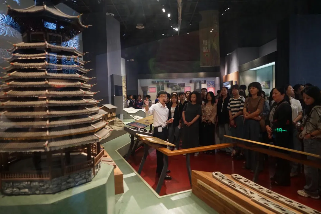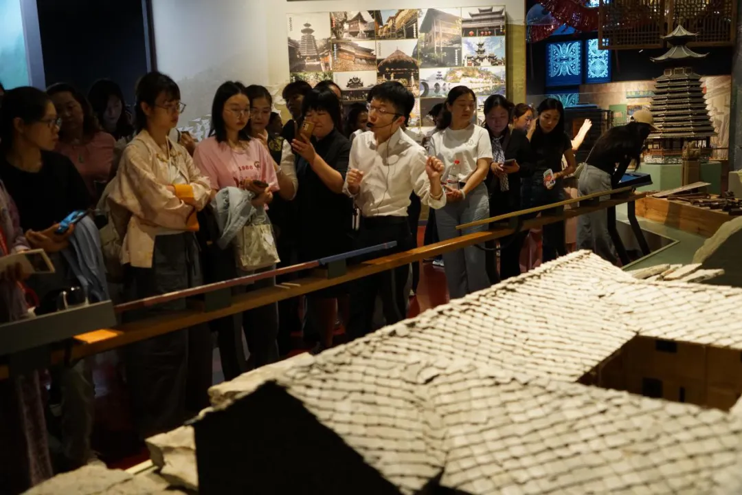 省非遗馆为此活动提供了公教讲解服务,在讲解员的带领下先后参观了省非遗馆展示厅及非遗文创集市。在展示厅,通过实物、实景模型、图版、音频、视频等方式对民间文学、传统音乐、传统舞蹈、传统戏剧等非遗十大类全方位的介绍让全体成员更加直观的了解贵州非遗,以传统方式和现代技术手段结合,立体具象地反映其存续状况。