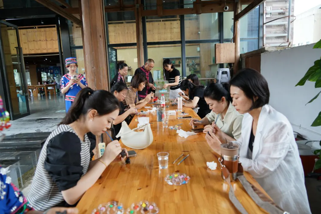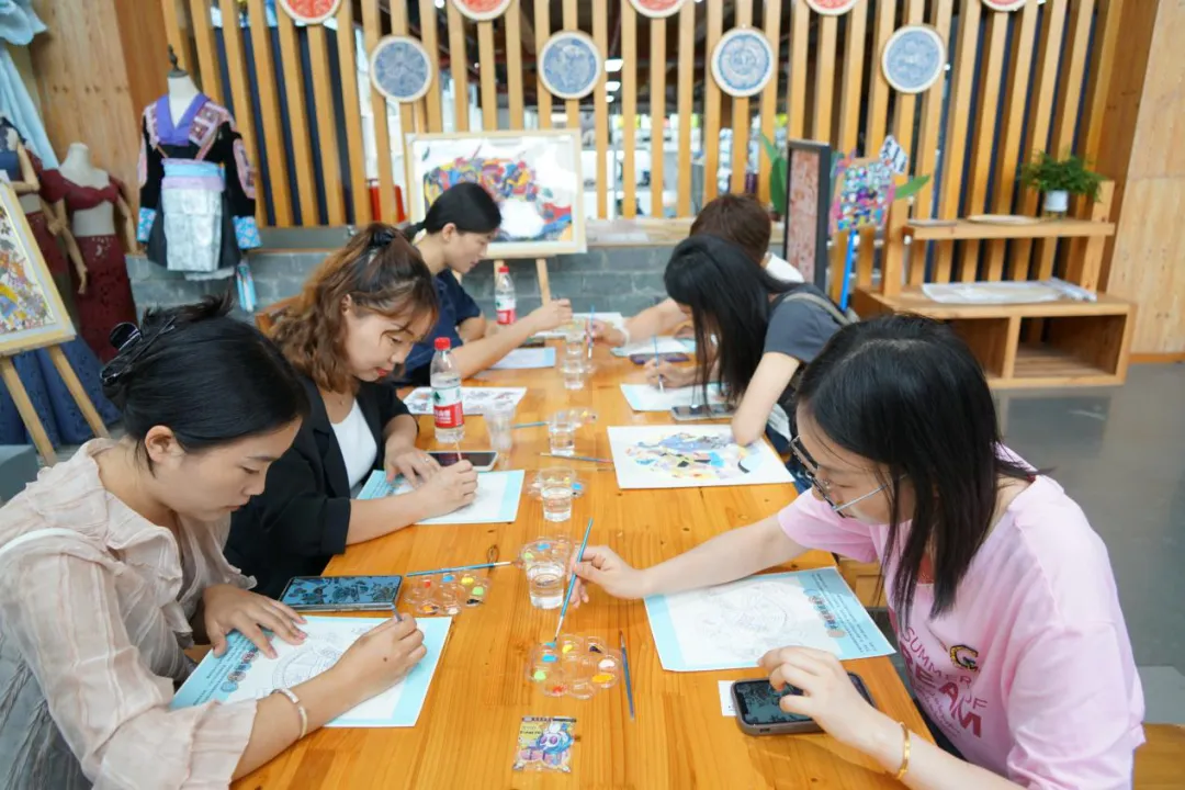 在非遗文创集市,全体成员对非遗文创产品连连称赞。表示,这些文创产品融入了多种非遗元素,在传承传统技艺基础上不但注重打造产品的体验性、实用性及生活性,而且还在深入挖掘非遗内涵,促进文旅融合发展的同时展示其历史、文化、科学及艺术等特征,是以文促旅,以旅彰文,推动文化与旅游深度融合重要表现,是非遗进校园的教育范本。随后,全体成员还体验了泥哨、蜡染、苗绣、农民画等非遗项目。