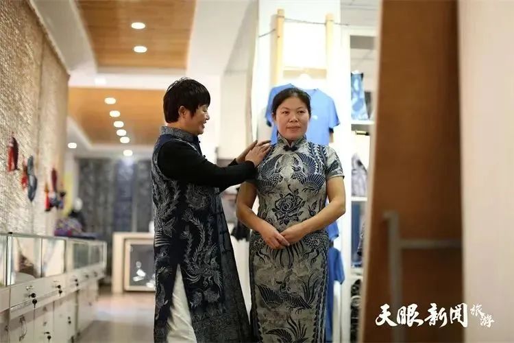 宁航蜡染工坊创办人宁曼丽(左)向顾客推介蜡染服装产品