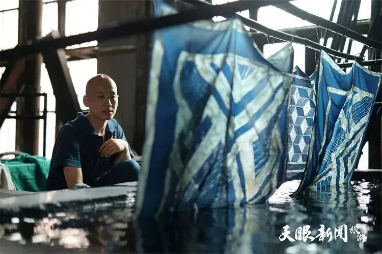 宁航蜡染工坊的设计师成昊在查看蜡染时装面料的浸染效果