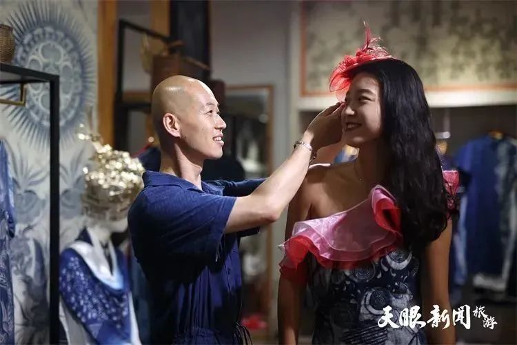 设计师成昊(右)给模特试穿新设计的蜡染时装