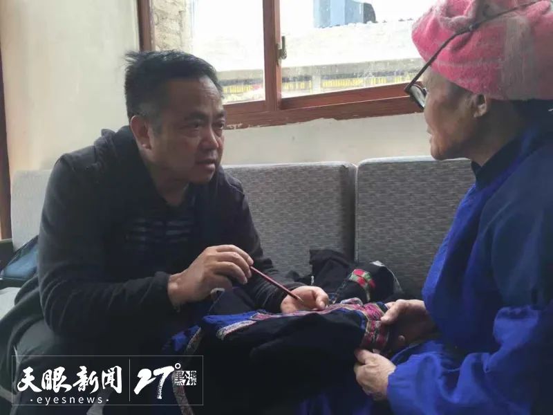 伍忠钢(左)与布依族老人交流布依族刺绣。
