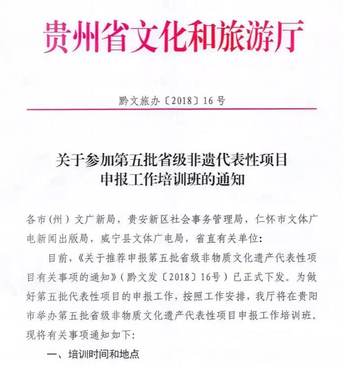 目前,《关于推荐申报第五批省级非物质文化遗产代表性项目有关事项的通知》(黔文发〔2018〕16号)已正式下发。为做好第五批代表性项目的申报工作,按照工作安排,我厅将在贵阳市举办第五批省级非物质文化遗产代表性项目申报工作培训班。现将有关事项通知如下: