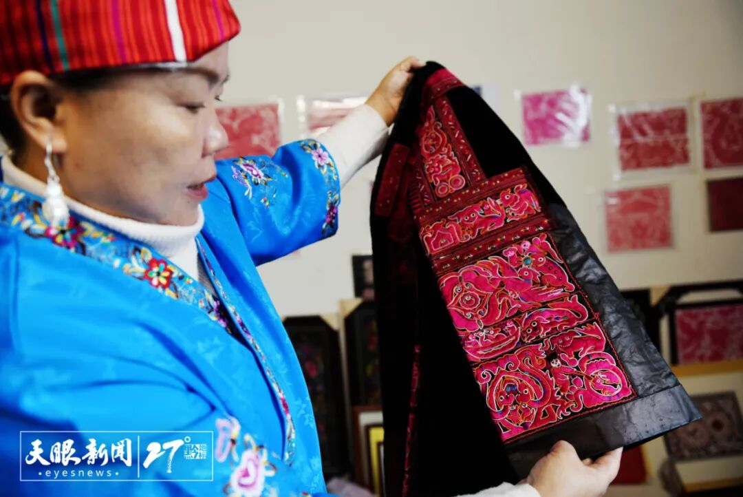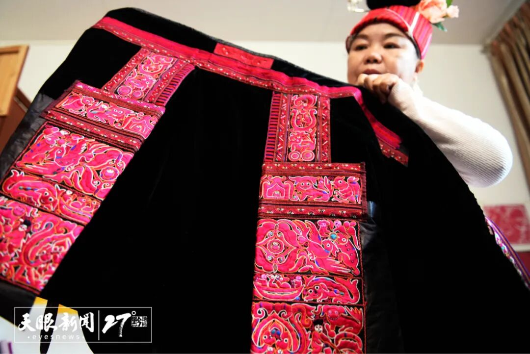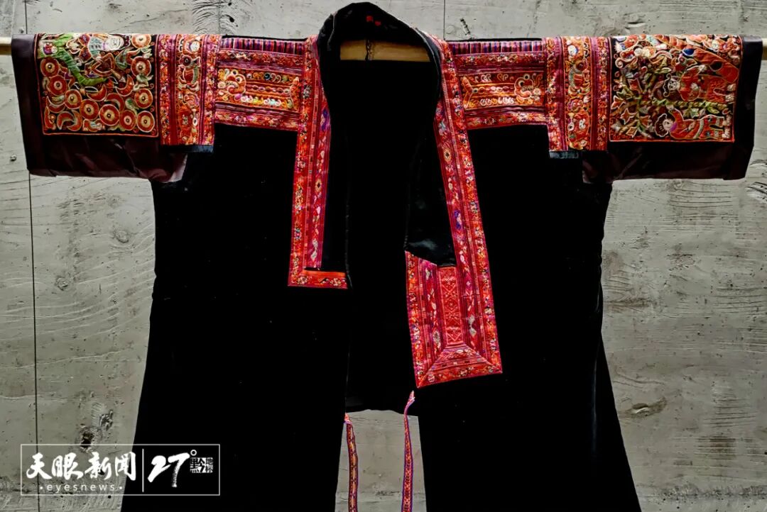 姜文英展示了自己家的宝贝——外婆的嫁衣。一件好的破线绣嫁衣可以传承数百年,色彩依然艳丽。