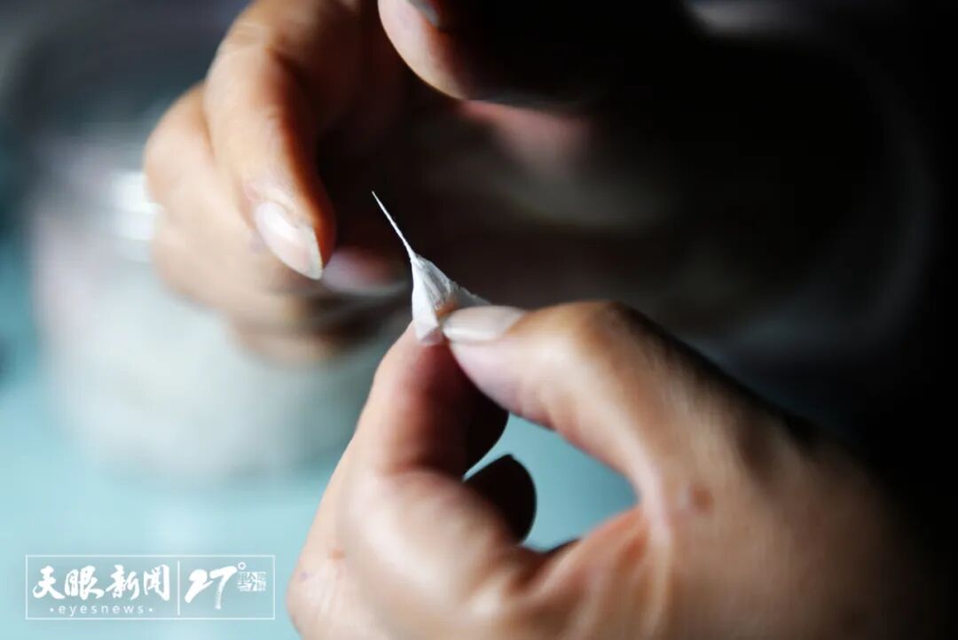 剪好的纸被固定在布面上,然后再进行刺绣,一件衣服通常需要上百张大大小小的剪纸。