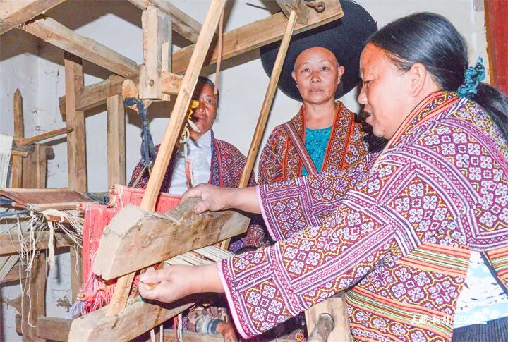 村民在织苗布