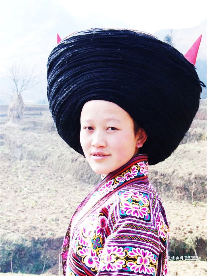 从装扮上来讲,纳雍箐苗头饰特点尤其突出。《山海经·大南荒经》载:“蚩尤氏耳鬓如剑戟,头有角,与轩辕斗,以角触人,人不能向。”《淮南子·齐俗训》载:“三苗髽(zhuā)首。”纳雍箐苗头饰即具有“髽首”“触角”等“族徽”标志。