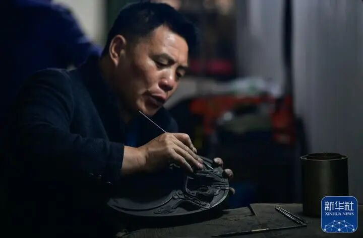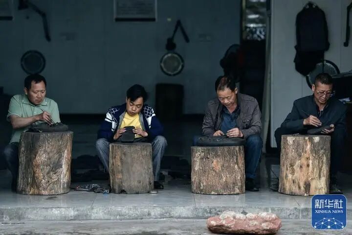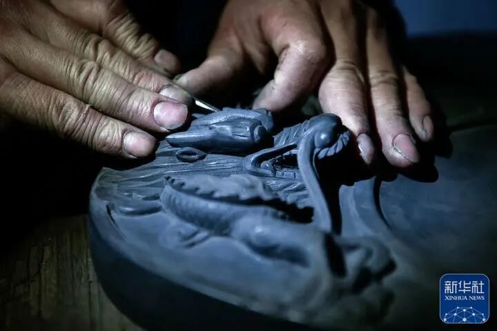 4月30日,在贵州省岑巩县思州石砚非遗传承基地,工匠在雕刻思州石砚。新华社记者 杨文斌 摄