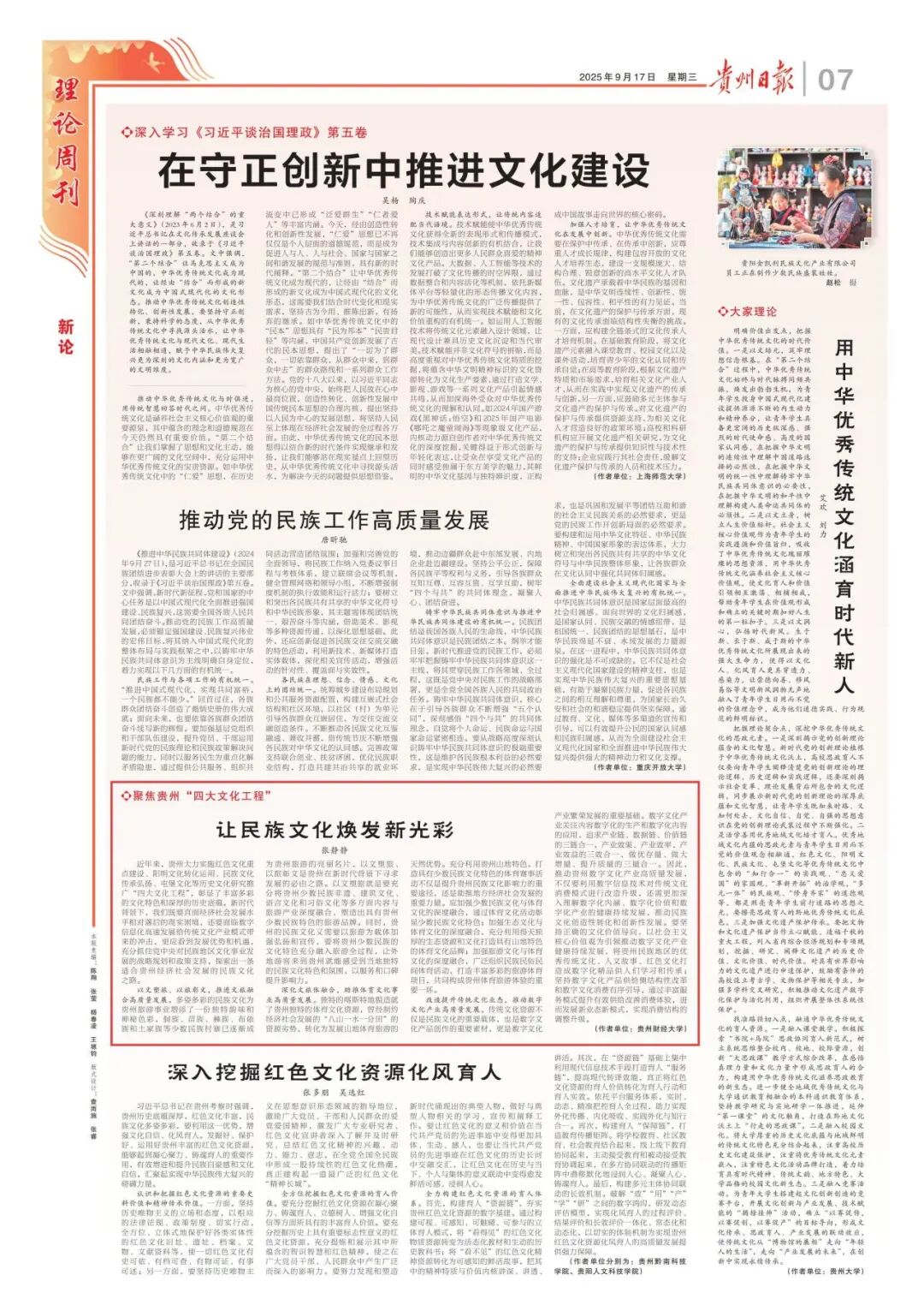 近年来,贵州大力实施红色文化重点建设、阳明文化转化运用、民族文化传承弘扬、屯堡文化等历史文化研究推广“四大文化工程”,彰显了丰富多彩的文化特色和深厚的历史底蕴。新时代背景下,我们既要直面经济社会发展水平相对落后的现实困境,还要面临数字信息化高速发展给传统文化产业模式带来的冲击,更应看到发展优势和机遇,充分抓住党中央对民族地区文化事业发展的战略规划和政策支持,探索出一条适合贵州经济社会发展的民族文化之路。