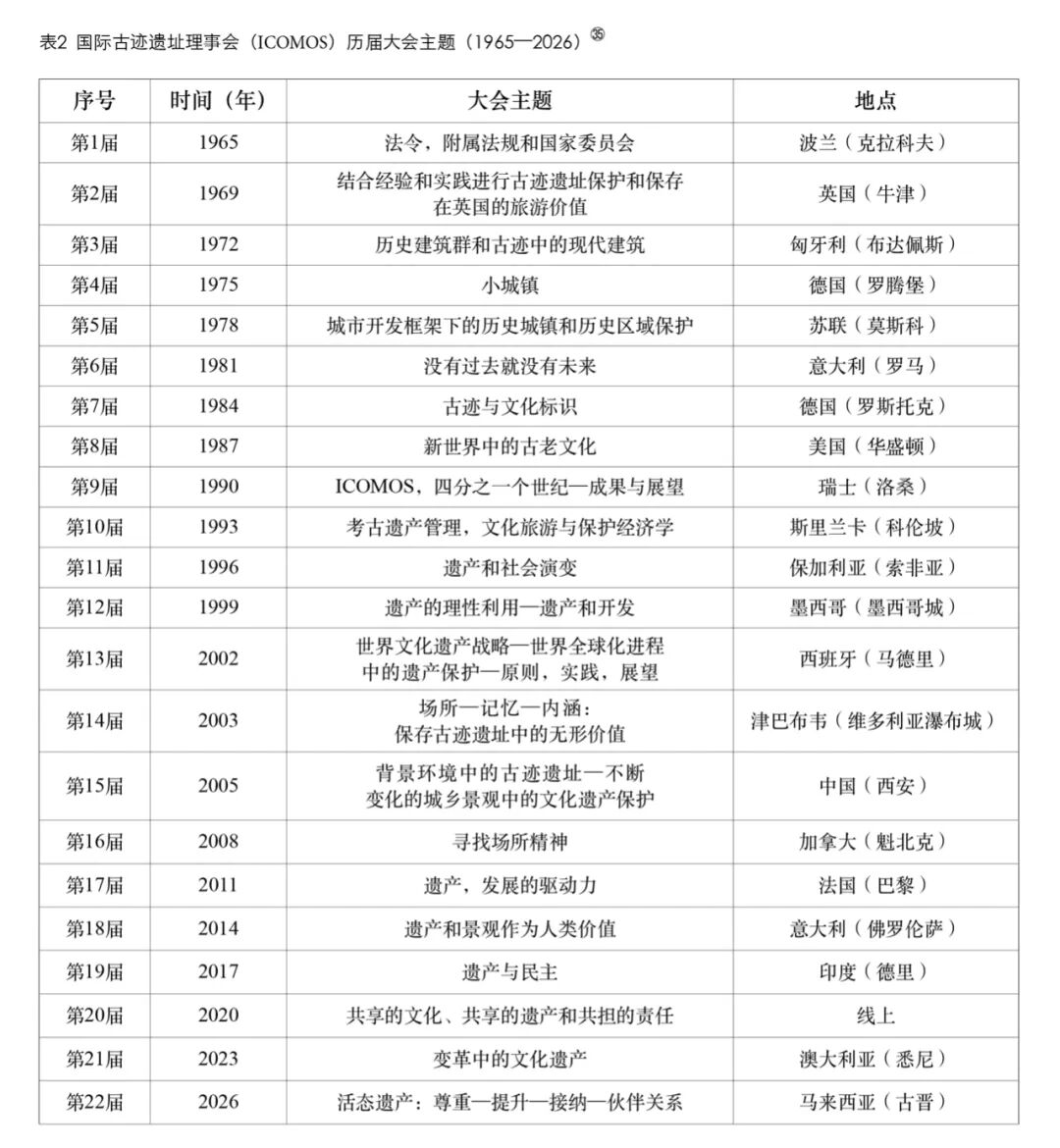 或者,也可以从国际古迹遗址理事会(ICOMOS)历届大会主题的变迁中,宏观勾勒出国际文化遗产领域的话语动向与关联知识(表2)。在跨越60余年的历程中,大会主题从最初更关注具体“物”,到20世纪80—90年代探讨遗产与社会发展关系,再发展到21世纪以来更侧重对人、精神需求、时代变革的关注与反思。尽管话题的重心不断转向,核心却始终探讨着文化遗产与人、社会的关系。