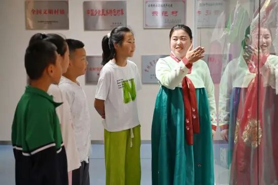 吉林省辽源市东辽县安石镇朝阳村的民族文化展示馆,工作人员带领研学团体验朝鲜族民俗文化
