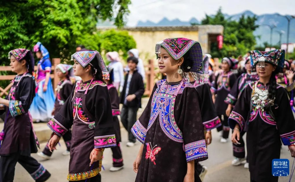 六盘水市六枝特区牂牁镇的布依族群众在进行巡游(6月29日摄)。