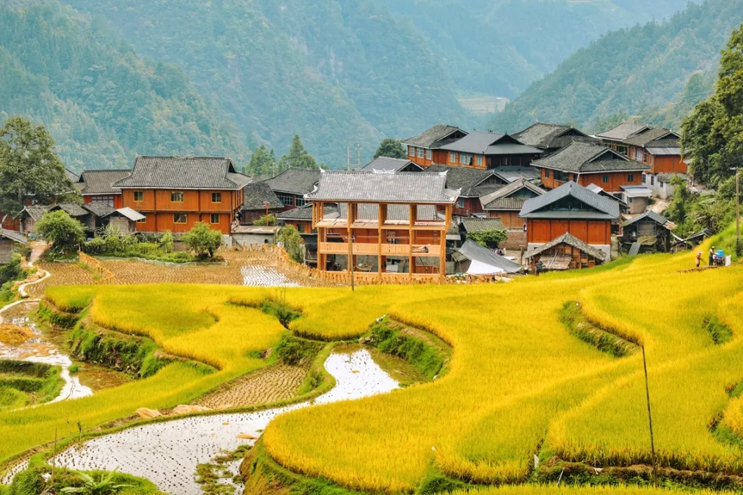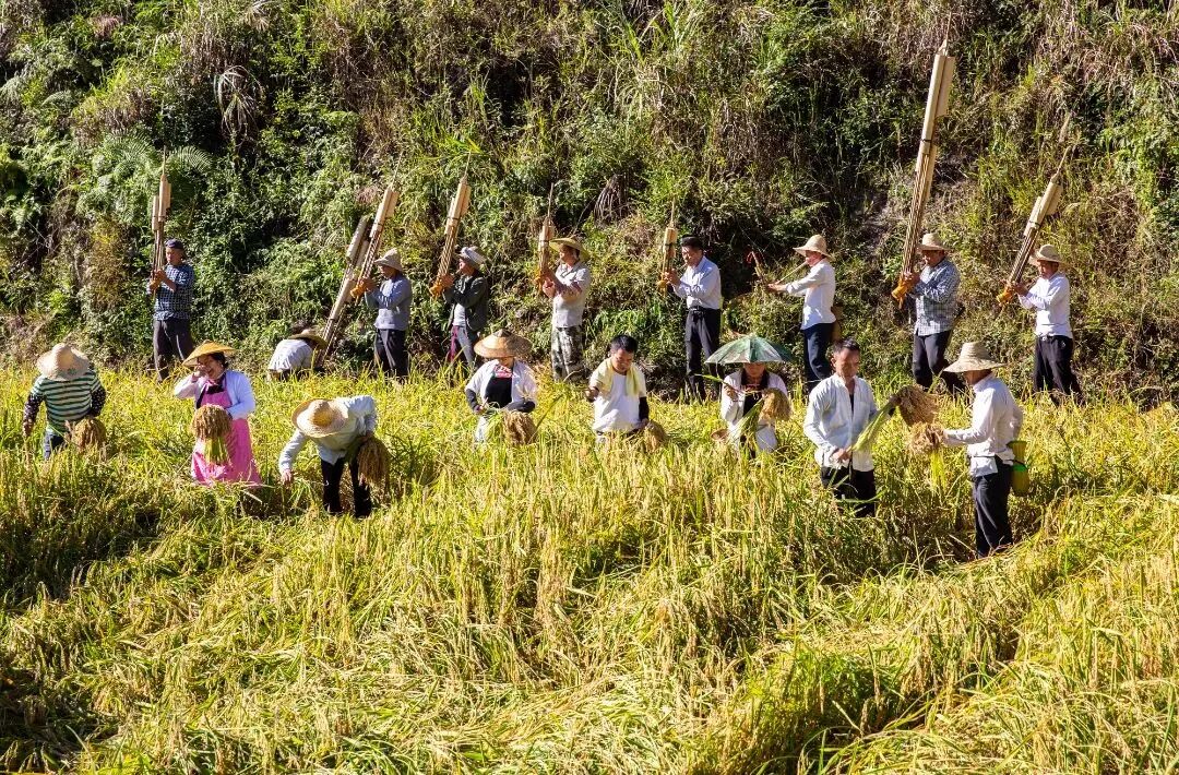 金黄秋季,美德村糯稻飘香、片片金黄、田畴似锦。布满山间的饱满禾糯在秋风吹拂下掀起层层稻浪,宛若世外桃源,让人沉醉其中。当地的田间地头,侗族同胞欢呼阵阵、侗歌声声,村民们吹响芦笙庆丰收,田间地头呈现一派好“丰”景。
