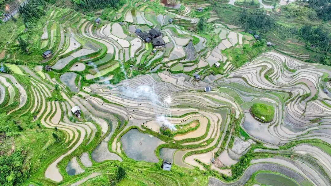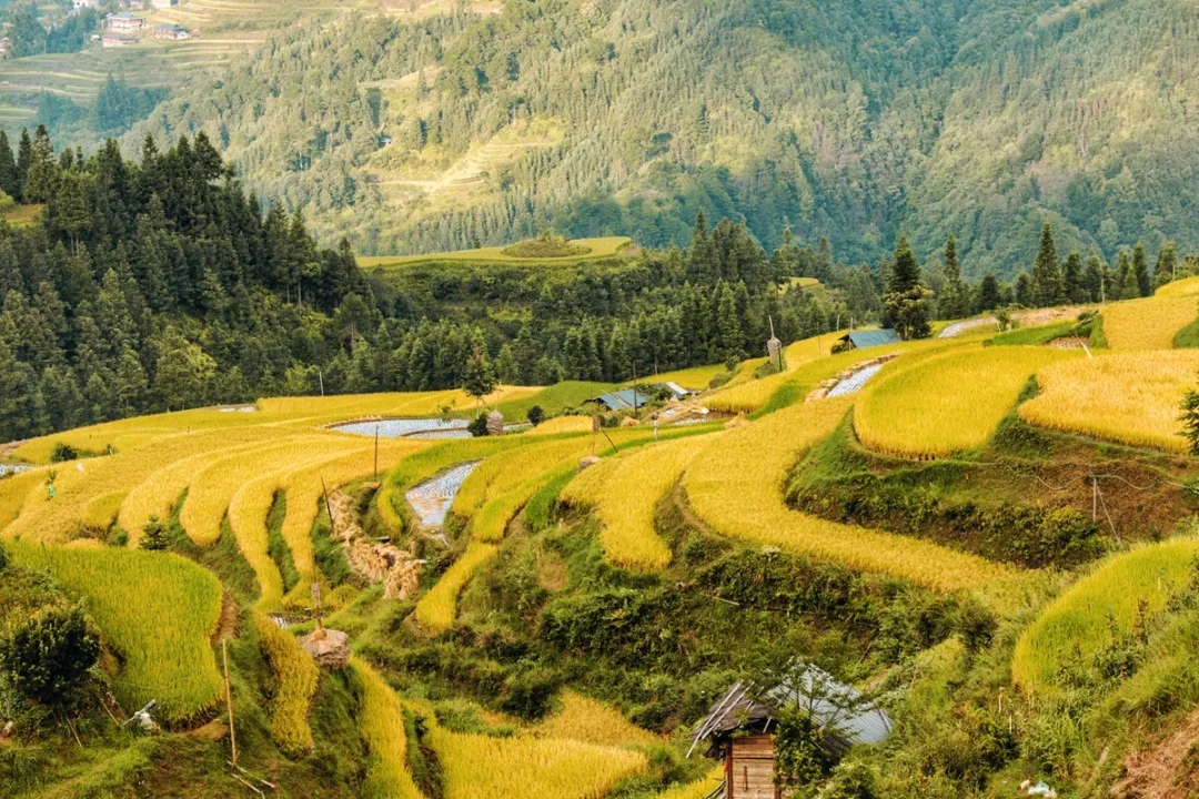 春天放水时,田里倒映着山间的绿植、云雾;夏天,田里绿油油的水稻,随着山风摇摆;秋天,万亩梯田都染上了金黄,如果刚好是收割的时候,还能拍到梯田的秋收风光。
