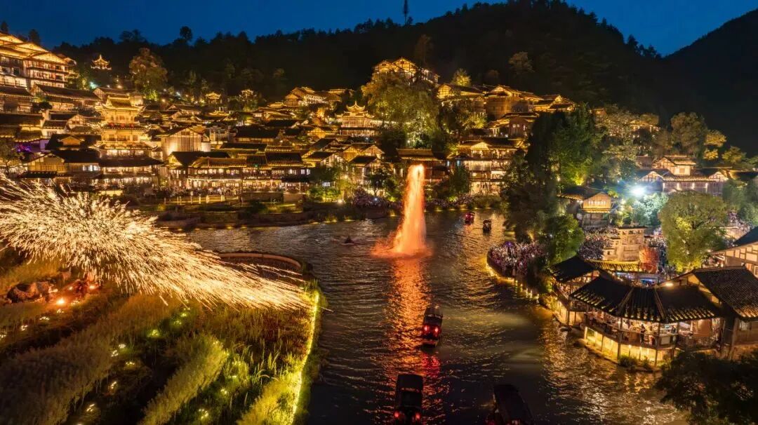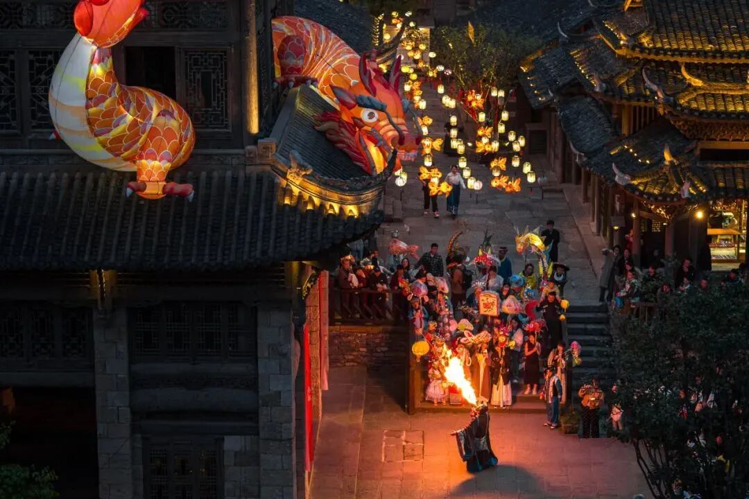 吊脚楼、摇橹船、独竹漂、苗族竹竿舞、孔明灯、染房纸坊戏台、茶楼…非遗文化为记忆留存了空间,真正的东方美学在此展现。景区内各种非遗文创店里,游客可以体验手工制作各类非遗文创产品,在手作中遇见古老技艺。