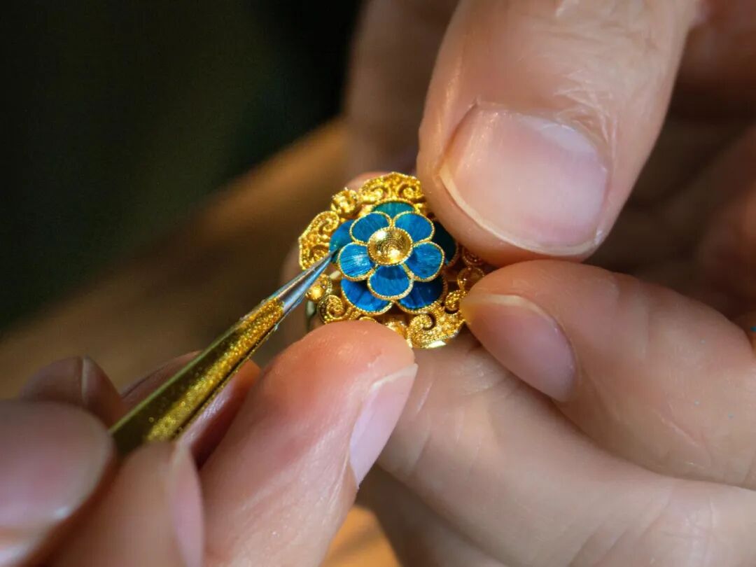 戏曲头饰点翠技艺源于中国古代点翠工艺。点翠是中国传统的金属工艺和羽毛工艺的结合,先用金或镏金的金属做成不同图案的底座,再把翠鸟背部亮丽的蓝色的羽毛仔细地镶嵌在座上,以制成各种首饰器物。点翠工艺制作出的首饰,光泽感好,色彩艳丽,而且永不褪色。其高超的技艺水平和不朽的艺术价值,充分体现了古代劳动人民的卓越才能和和艺术创造力。