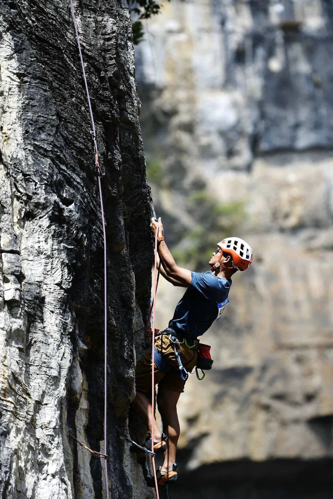 这座超级大桥所带来的,远不止高桥极限运动的刺激,花江峡谷大桥在桥体中央打造长达300米的巨型水幕画卷,通过高精度激光投影系统,将大桥变成“峡谷IMAX”。吊索外侧安装“琴弦”式亮化装置,灯光可随音乐变换色彩与频率,就像是一部巨型音乐游戏。当然,你所游览的林林总总的贵州秋景,或许就是无数户外爱好者们追寻的理想天堂。黔西南州兴义世界地质公园,还有另外的打开方式。数条专业的骑行绿道、彩色马拉松步道,穿梭在喀斯特峰林间。数千座喀斯特山峰脚下,金色的稻田如同地毯铺展,这幅生动的丰收图景与运动者的身影同框,“人在画中行”,是万峰林最动感的玩法。藏在黔东南州九万大山中的加榜梯田,则是徒步爱好者的圣地。当稻谷逐渐被秋天染成金色,层层叠叠的大山造就了如同鱼鳞一般的梯田,秋光在山坡上错落的水田中流转,在秋阳的照耀下宛如金色瀑布从山腰倾泻而下。泥土与禾叶交融的芬芳,一路伴随着这场身心的盛宴。在山地王国,怎能没有飞檐走壁的体验呢?攀岩在这里不再是运动员的专利,黔西南州安龙国家山地户外运动示范公园在天然岩壁上打造的攀岩项目“飞拉达”,安全防护措施和脚蹬让它成为普通人的“岩壁华尔兹”。“上天”后,贵州还能让你达成“入地”成就。洞穴露营让地心与星空在此达成奇妙和解。当暮色浸染森林,躺在黔南州荔波酷玩森林公园内的喀斯特溶洞里,帐篷暖灯与光年外的银河遥相呼应。晨间被洞口泻下的第一缕天光唤醒,这是属于探险者的极致浪漫。