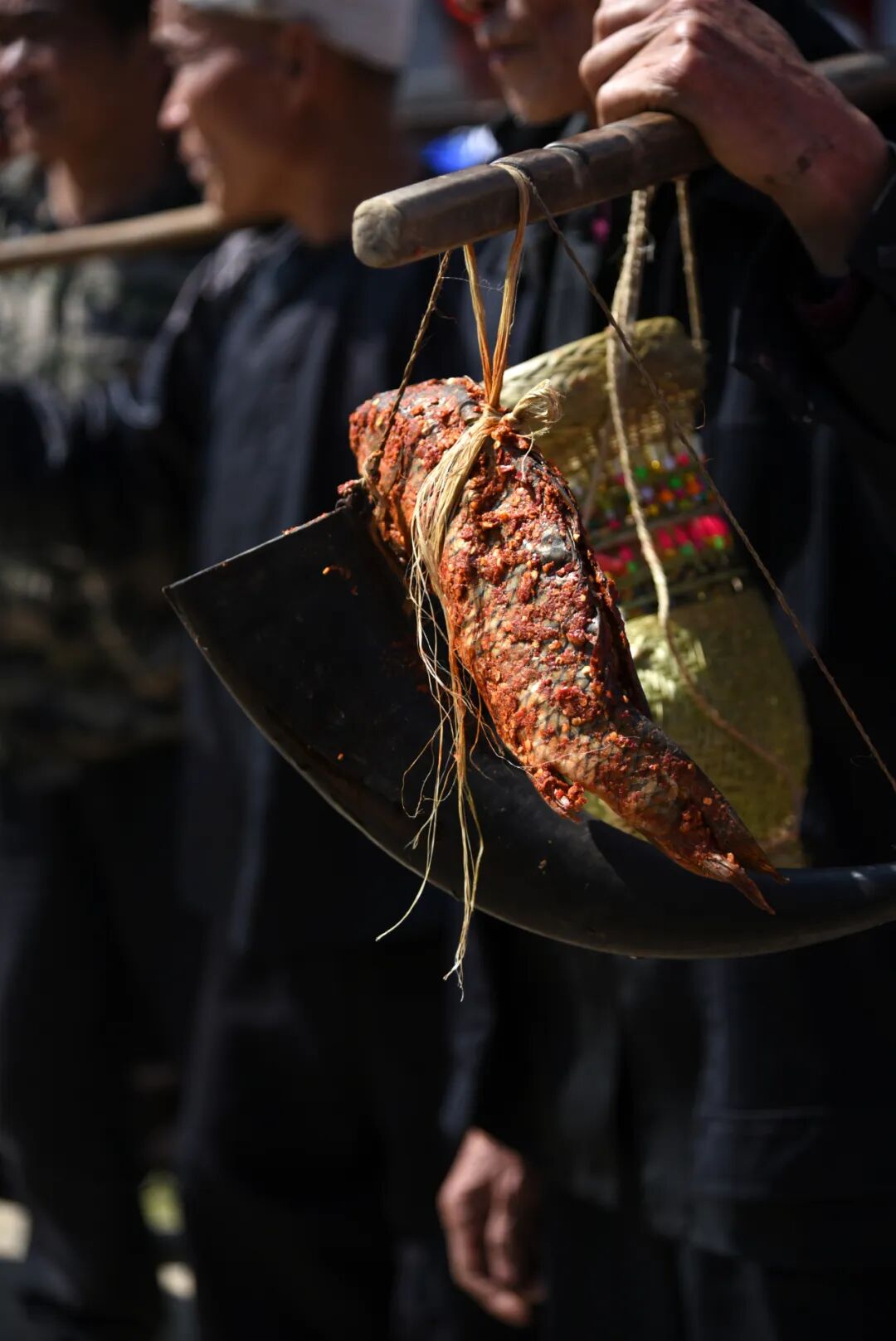 遵义市务川县仡佬族的吃新节,又被亲切地称为“白吃节”,家家户户都会在门前摆起“食台”,上面堆满了新收获的稻谷、玉米、瓜果,主打一个慷慨的分享。这都源于仡佬族对于自然的敬畏,他们认为农事收获是自然所赐予的。供奉新谷、祭拜谷神、祭祀祖先,祈求风调雨顺、宴席尝新等节日程序,在贵州各地大多相似。黔东南州从江县高增侗寨则有着仪式感十足的“舌尖盛宴”,其隆重程度仅次于春节,“吃”新有着严格的程序。吃新节当天,要一起制作腌鱼,鱼“多子”多福,是丰收的象征。节日第一天,先是全鱼宴,鱼生、烧鱼、炒鱼、酸汤鱼、清汤鱼,能想到的统统来一遍;第二天是全牛宴,其中牛瘪是必不可少的待客上品。腌鱼和牛瘪火锅,仪式感十足。