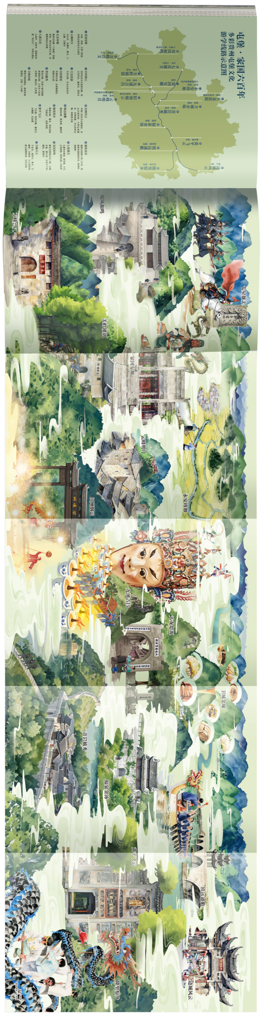 我们更通过“巨幅拉页,尽览屯堡文化”的设计思路,在6幅全开全景拉页中,正面从空间维度展现“屯堡文化游学线路”手绘地图,背面则锚定时间维度,结合农历时序梳理重要节庆与活动,交织成一幅可读、可感、可行的屯堡文化长卷。