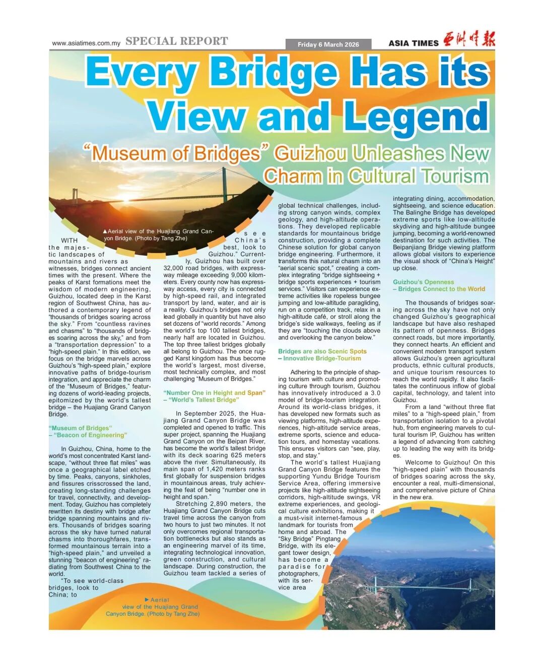 马来西亚《亚洲时报》以《一桥一风景——“万桥飞架”的贵州绽放桥旅新魅力》为题推出整版报道。