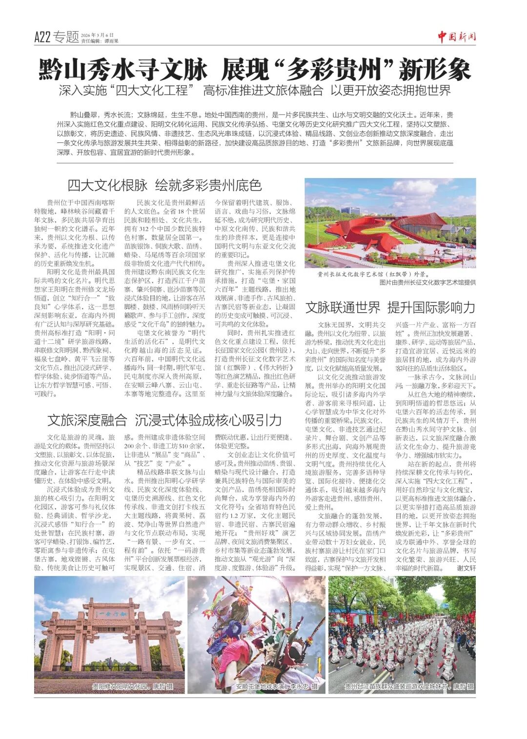 3月6日,2026年全国两会正在进行时,世界的目光聚焦中国,也悄然投向了位于中国西南的宝藏省份——贵州。马来西亚《亚洲时报》、泰国《星暹日报》、香港《香港商报》及中国新闻社旗下《中国新闻》报分别推出整版专题报道,聚焦贵州文旅高质量发展,从桥旅融合、“村字号”“四大文化工程”等多个维度,向世界展示贵州文化旅游新风采。