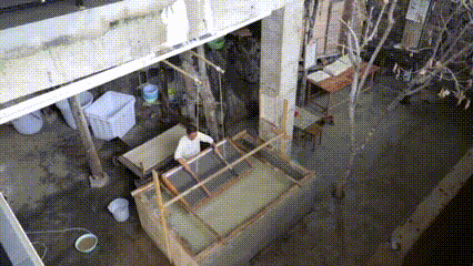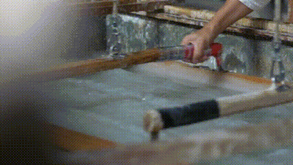 2、制纸:将棉絮纸浆兑水按一定的比例添加滑药,搅拌均匀,再经过抄纸、压纸、晒纸、揭纸、包装为成品。