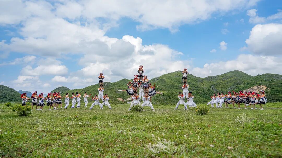 “滚山珠”演员在贵州民族团结大巡游活动前彩排