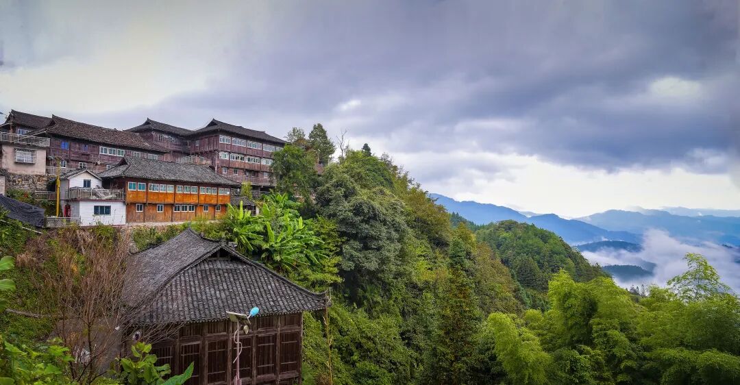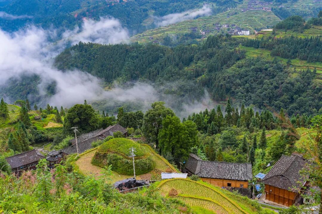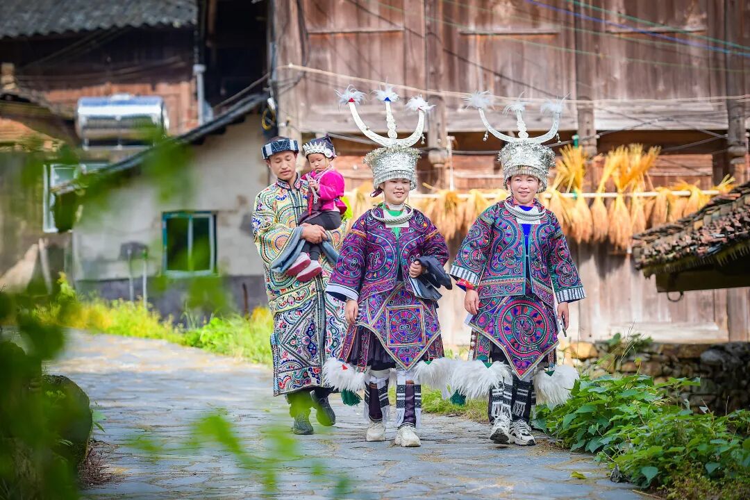 也蒙村苗族人民身穿百鸟衣走在村寨小道上
