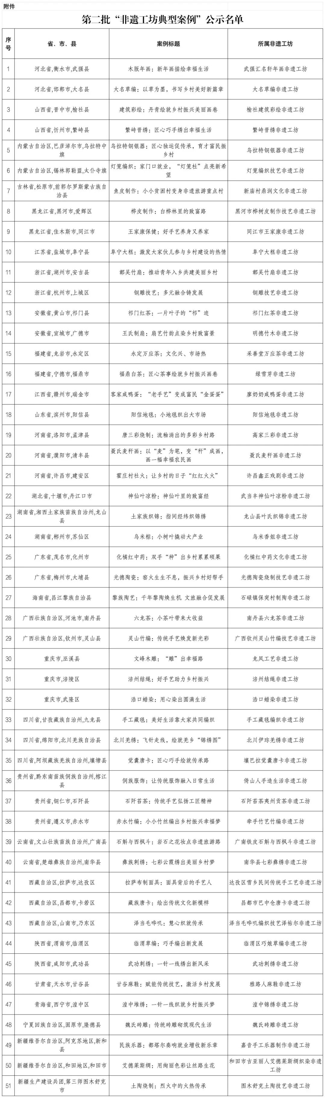 根据《文化和旅游部办公厅 人力资源社会保障部办公厅 农业农村部办公厅关于推荐第二批“非遗工坊典型案例”的通知》,经各省推荐和专家评议,第二批“非遗工坊典型案例”推荐和遴选工作于日前结束。现将推荐名单进行公示。