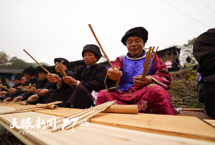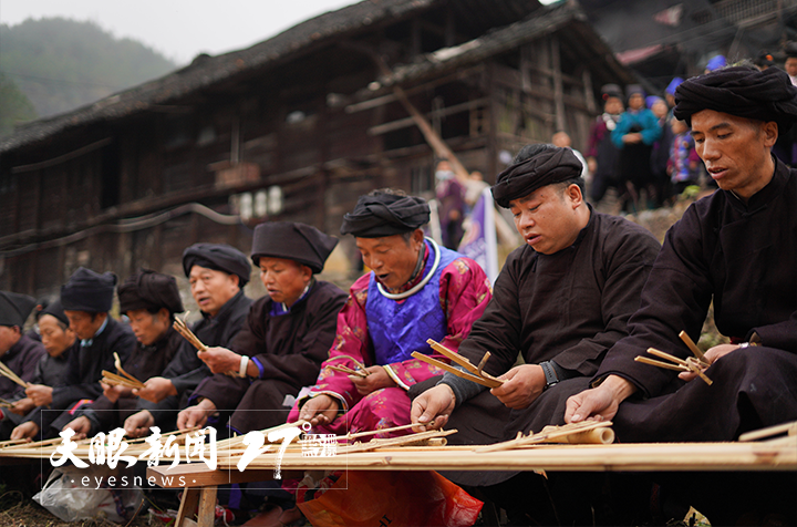 1尺2寸长的竹片,一支在面前横放,其余拿在手中,每诵完一段,就拿起一块搭在面前的竹片上,放完12块,就诵完了一组。这是国家级非遗传承人丹寨县扬武镇扬颂村贾师李会堂颂“理”的场景。“理”就是贾理,苗族贾理是苗族先民言行必遵的准则。“人学贾理之后,就能懂得做人做事的道理。”李会堂告诉记者, 他从学习到独立演出共用了10年时间。在李会堂将所有的贾理内容熟记后,父亲上山为他砍来竹子,锯成12根大约40厘米的竹签,制成贾签,交到了他的手中。至此,李会堂获得了贾师的“从业许可证”。通晓《开天立地》《洪水滔天》《葫芦兄妹》《梨果柿树》《妹榜妹留》等内容,并熟练掌握与之相关仪式,成为《苗族贾理》第五代传承人。