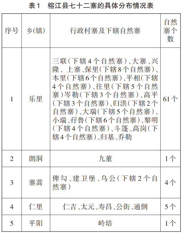 榕江县的七十二寨,主要分布在该县的东北至北部的乐里镇、寨蒿镇、朗洞镇、仁里乡、平阳乡等乡(镇)下辖的部分行政村寨。这些行政村寨中由多个自然寨组成,有侗族、苗族、汉族、水族等民族村寨七十余个,即七十二寨。现在的七十二寨,既是历史沿革的延续,又是民族文化特色保存较为完好的区域。