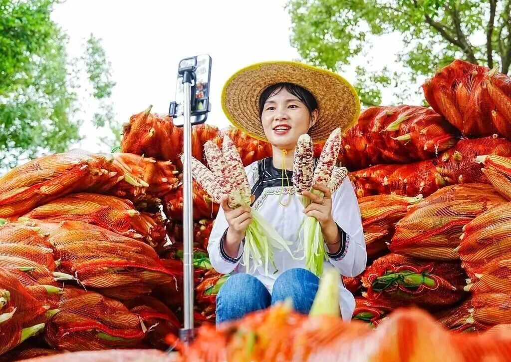 新媒体主播杨杰在榕江县车江大坝通过助农直播推介当地新鲜玉米(图片来源:天眼新闻)