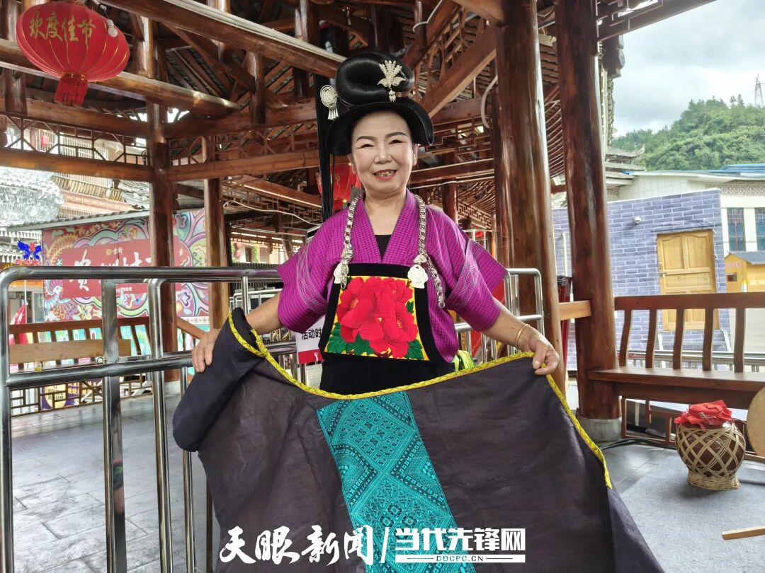 8月22日中午,潘英一袭红紫色对襟绸褂,配上黑色土布绣花围裙,将前额发丝挽成富有特色的倒S髻,从凯里市舟溪镇曼洞村出发,前往贵州“村T”活动现场。当晚,和她一起登台亮相的,还有陪伴她大半生的织布机。