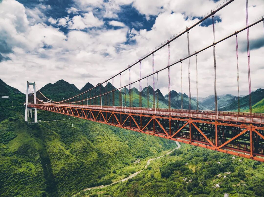 登天眼步道时,湖南阿姨兴致昂昂地分享,她们也打算去黄果树瀑布旁的坝陵河大桥“瞧一瞧”。从高山深切近600米的河谷,距谷底高达370米的橙红色桥面,还未进入,坝陵河大桥已以险峻傲然之姿,先给到访游客来了一点真实的震撼。这座20年前开工建设,主跨1088米、全长2237米的大桥,2009年建成时成为“国内第一,世界第六”的大跨径钢桁梁悬索桥。