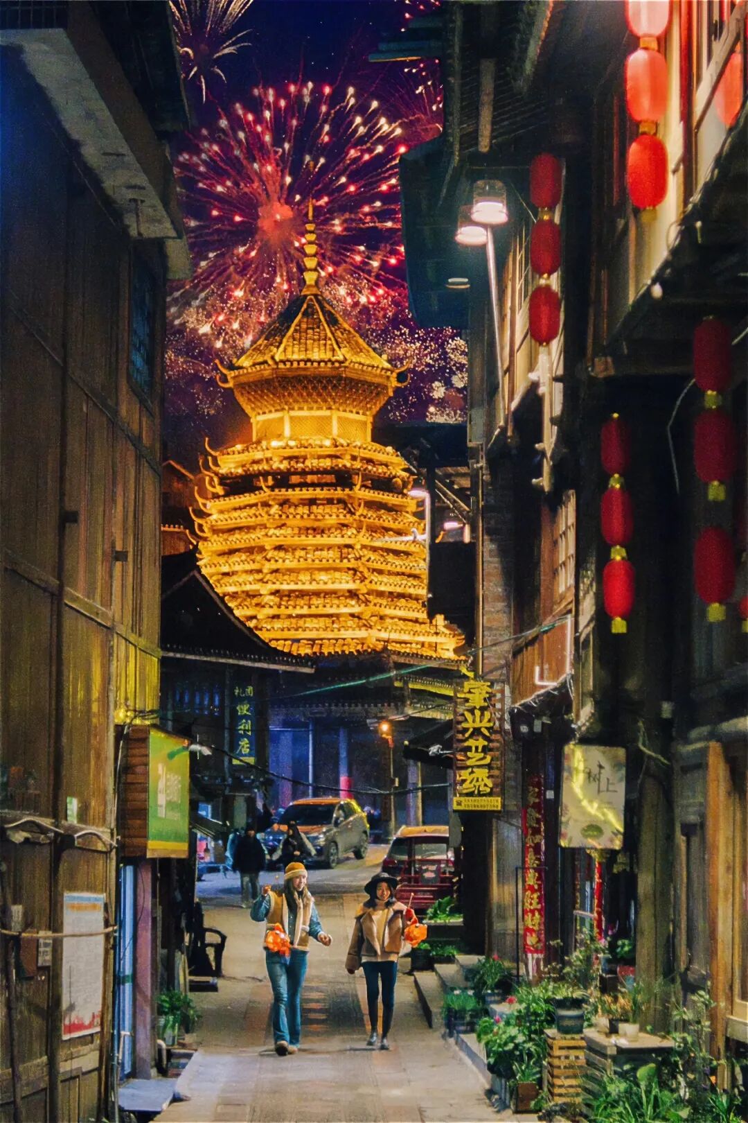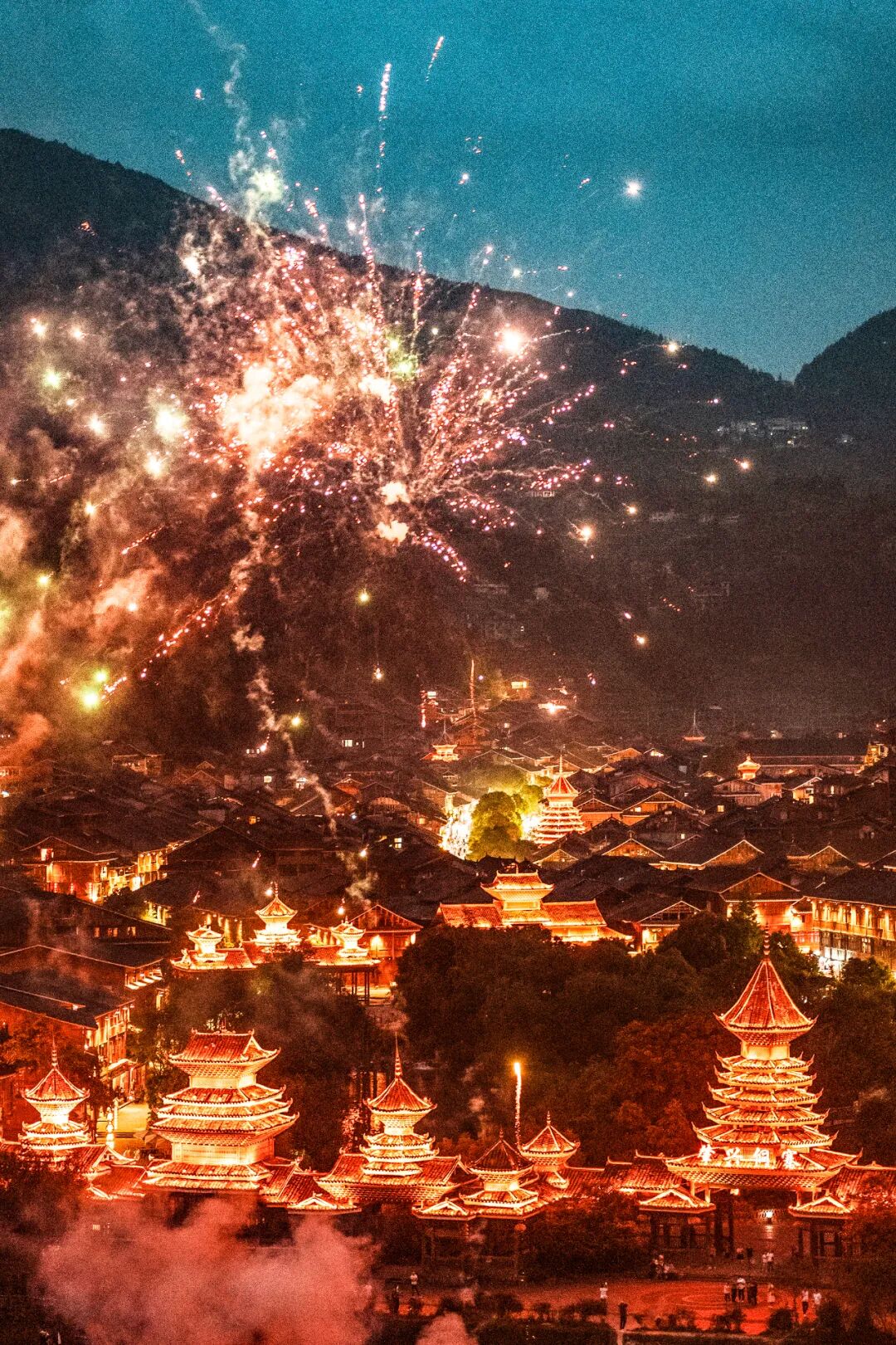 肇兴侗寨的春节,有鼓楼与烟花同框。
