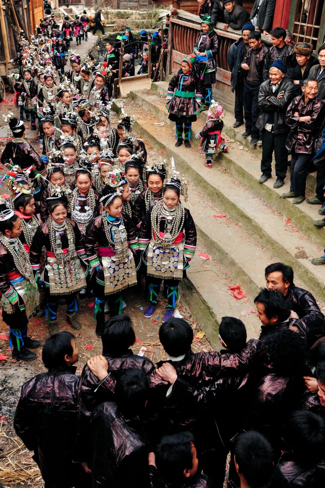 人们围成多层的圆圈,随着芦笙的旋律起舞,名为“跳月”或“跳洞”。对于村寨里的年轻人来说,这是一年中最重要的社交场。平日里去往外地务工、求学的青年男女,利用年节的机会回到村寨,展示盛装,比赛芦笙,在芦笙场上通过眼神、舞姿和音乐沟通,进而相识、相知、相恋,这是独属于山民的“浪漫满冬”。