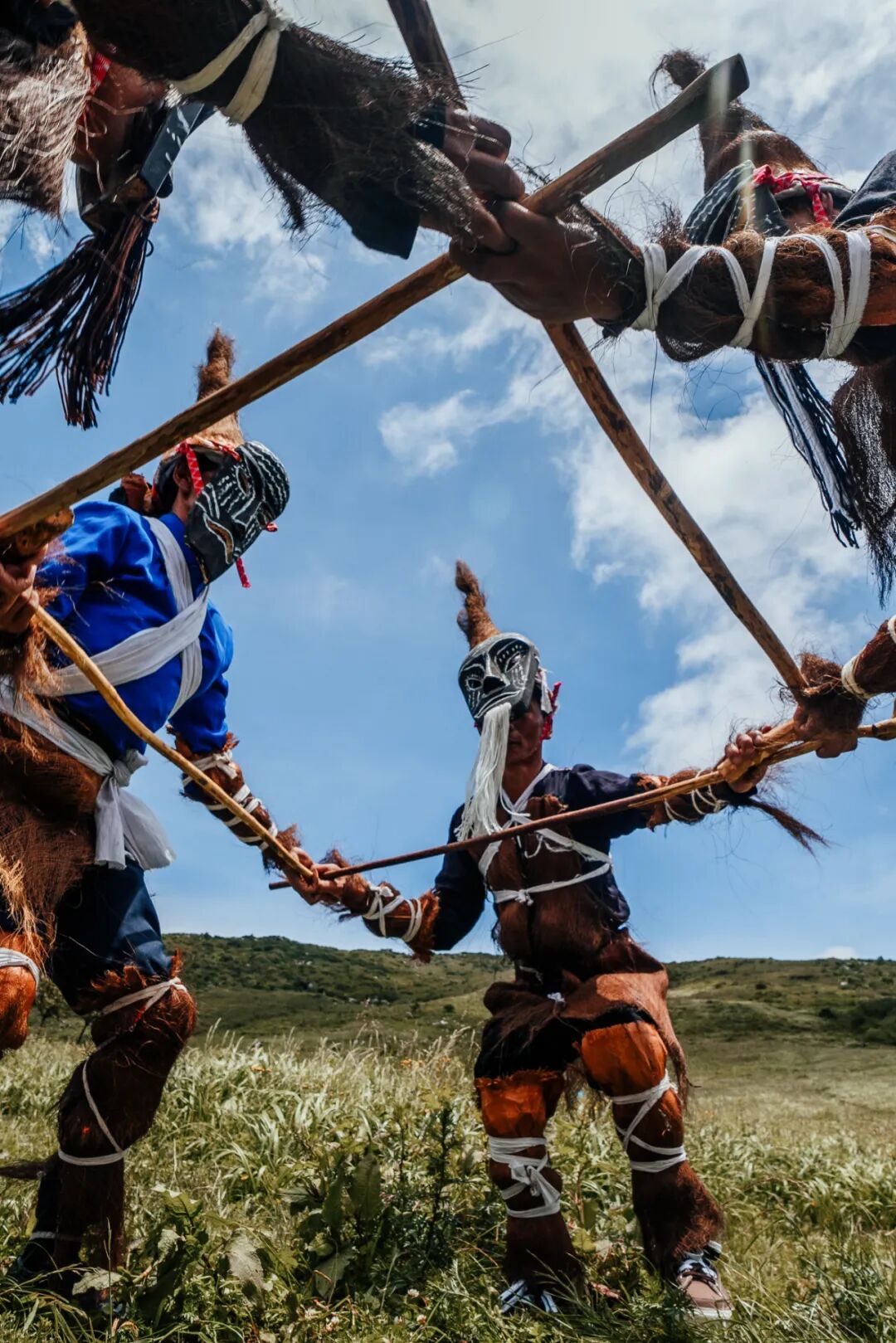 撮泰吉一般于农历正月初三至十五举行,主要的功能是挨家挨户扫寨,祝福五谷丰登、人畜兴旺。演员们戴着古朴夸张的木制面具,演绎祖先迁徙、繁衍、开荒、耕作、丰收的故事,恰好与草海边候鸟的迁徙遥相呼应。过年,此刻不再仅仅是人的节日,也是万物生灵的共同庆典。