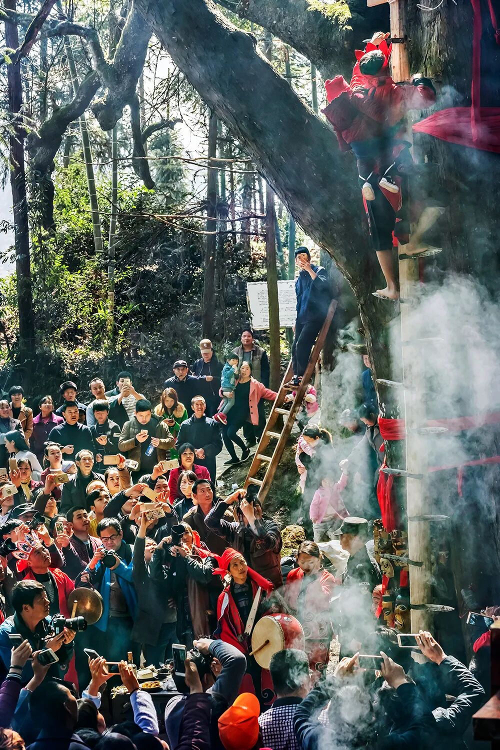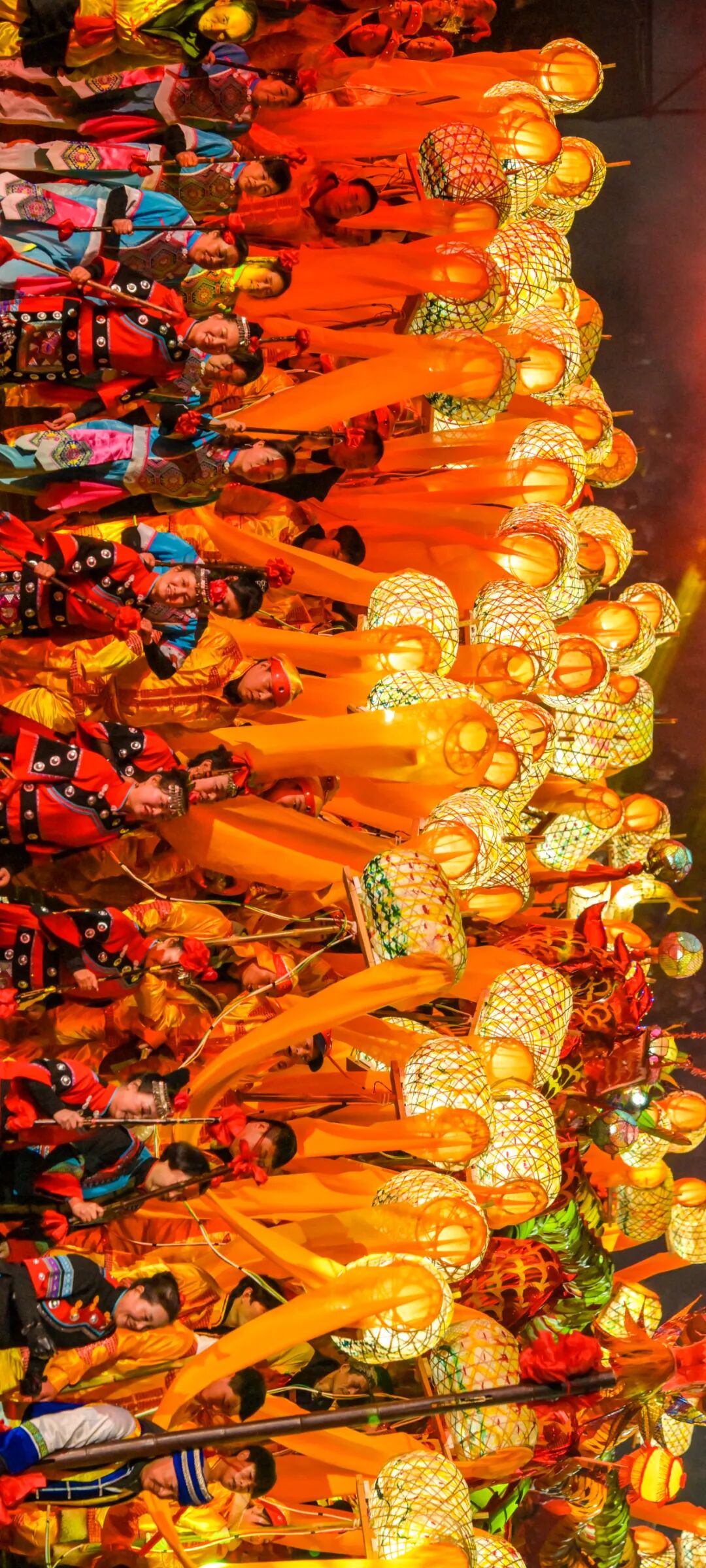 在铜仁市松桃苗族自治县寨英村,每年的正月初六至十五都会迎来“滚龙”。龙身长达36米,需要60至80名表演者合作,才能使其在夜色中翻腾起来。竹编纸糊的龙身上点着石蜡炒纸做成的捻子,夜幕下宛如真龙降世;在石阡,仡佬族的“毛龙”用竹子和火草秆编织而成,看上去满身是毛,在黄烟萦绕之中舞动,宛如腾云驾雾;在万山,鼟锣(侗语,敲锣比赛)更加令人血脉偾张,参与者少的几十人,多的可以达到数千人,比赛一开始,常常就是通宵达旦,这是土家族人对好年景最热烈的盼望。