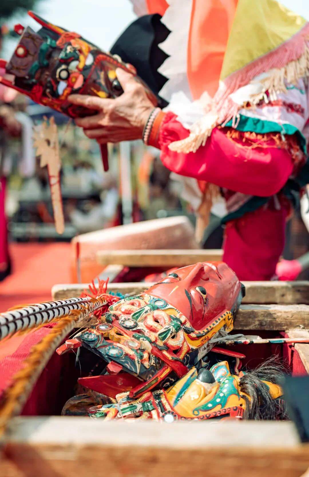 在屯堡,年味是伴随着开箱声苏醒的。村民们小心翼翼地从木箱里“请”出地戏“脸子”(面具)。白杨木雕刻的关羽、张飞面具,怒目圆睁,色彩鲜艳。戴上面具的那一刻,平时沉默寡言,只顾在田间劳作的汉子立刻变身镇守边疆的将军。这种“人神合一”的瞬间,比任何精心排练的晚会都更让人震撼。