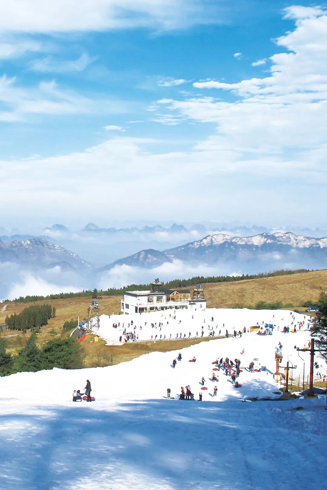 在贵州滑雪,远处还能看见一片绿色。