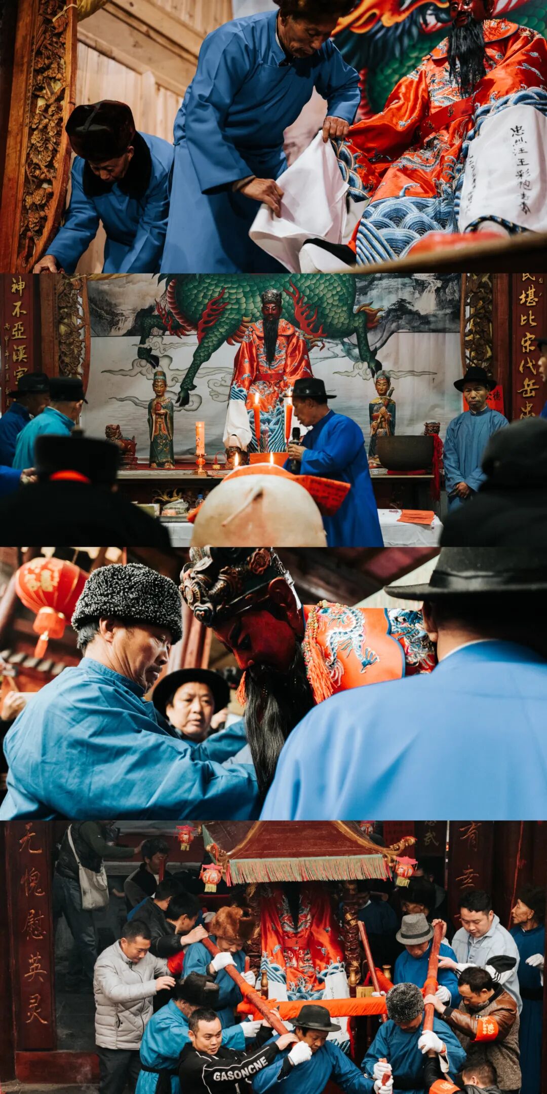 最能牵动屯堡人家国之思的,是“抬汪公”活动。每年正月十六的狗场屯、正月十七的鲍家屯、正月十八(汪公诞辰日)的吉昌屯,都要举行这一庄重的活动。汪公原名汪华,隋朝末年,天下大乱,汪华顺势起兵,割据于歙州(今安徽南部)。唐朝建立后,汪华降唐,受封为“越国公”,歙州人为了纪念他而修建了汪公庙。明初,来自江南的屯军进入贵州,汪公信仰也随之来到安顺。如今,屯堡后裔远在江南的宗亲也会在“抬汪公”期间来到安顺,与族人一起祭祀祖先,追寻他们共同的历史记忆。