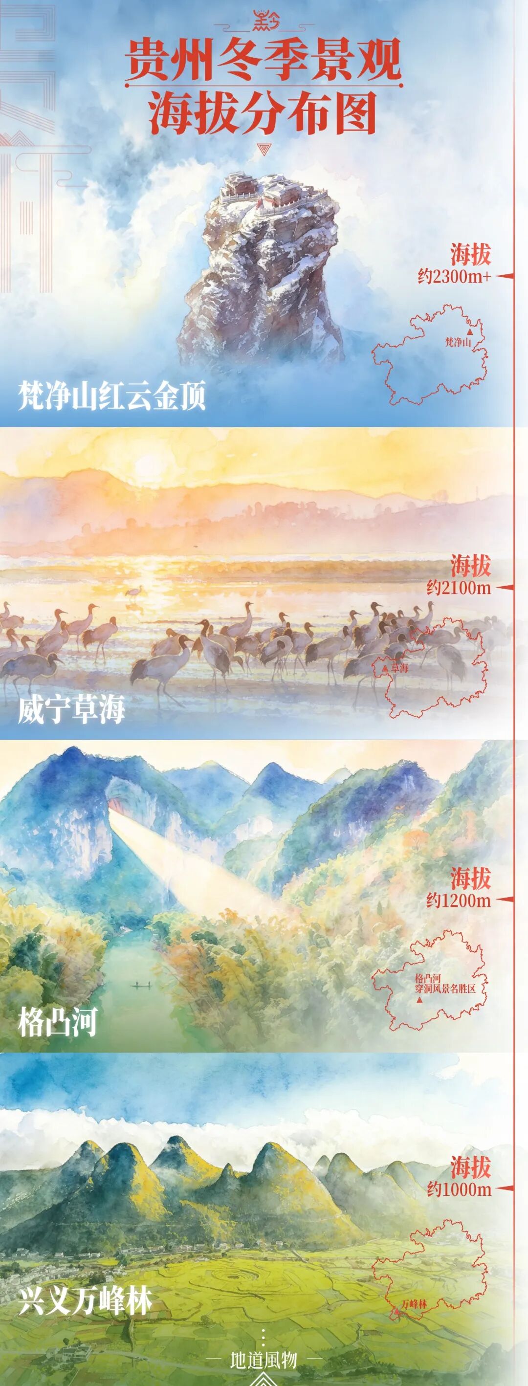 很多人对贵州的印象停留在夏季的避暑天堂,却不知冬日的贵州更是别有一番风景。相较于北国风光的千里冰封、万里雪飘,贵州的冬季呈现出一种层次丰富的“限定版年景”。在这里,由于海拔的差异和复杂的微气候,雪景、草海、晨雾、神光与花海竟然可以在同一个季节里依次展开。
