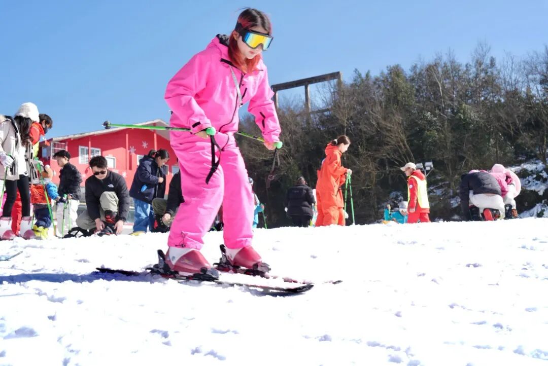 游客体验“中国纬度最低”的室外滑雪场,六盘水玉舍雪山滑雪场。