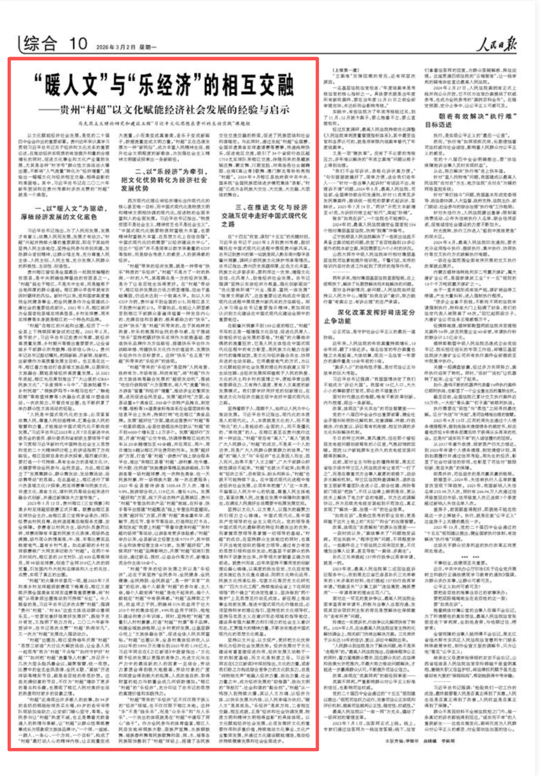 今天,《人民日报》以五分之三个版刊发马克思主义理论研究和建设工程“习近平文化思想在贵州的生动实践”课题组撰写的文章《“暖人文”与“乐经济”的相互交融——贵州“村超”以文化赋能经济社会发展的经验与启示》。