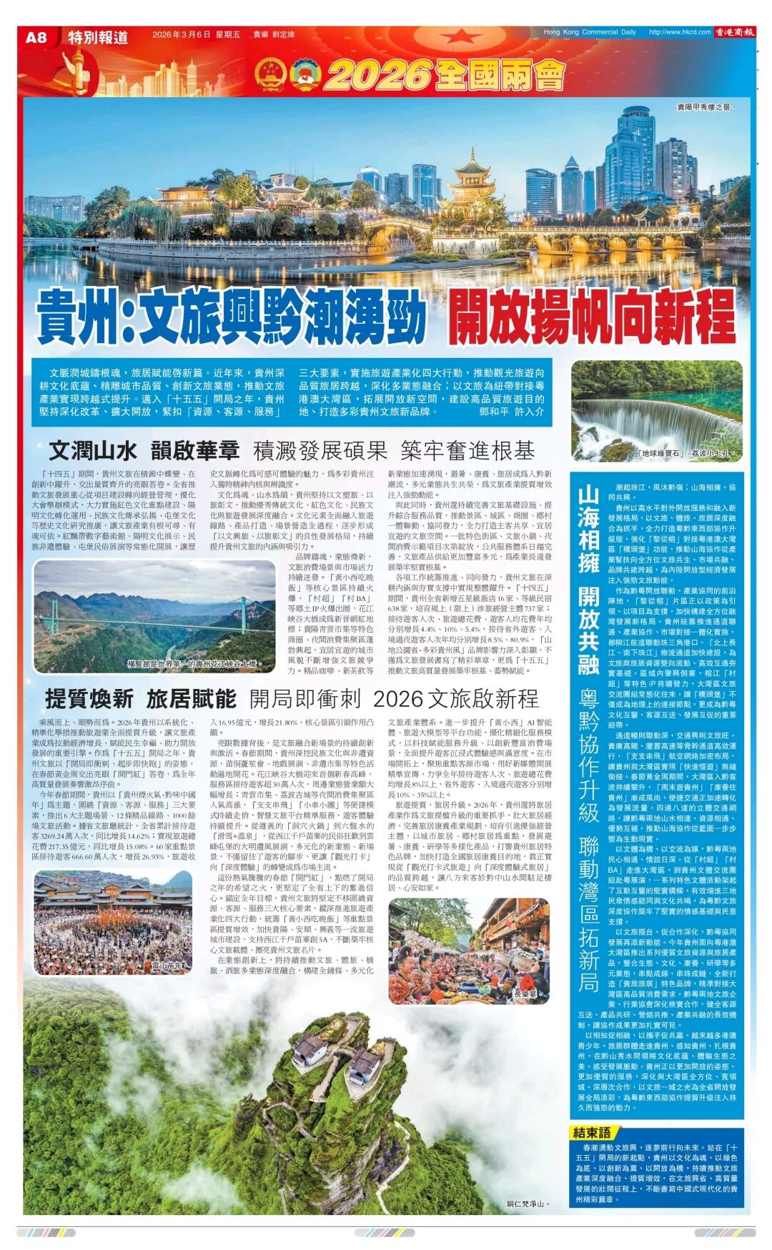 立足粤港澳大湾区视角,《香港商报》以《贵州:文旅兴黔潮涌劲 开放扬帆向新程》为题推出一个整版报道。从资源禀赋到开放步伐,从文旅新场景到旅居新业态,全景式展现了“十四五”时期贵州文旅产业高质量发展成效。字里行间,“黔山秀水”正携着清新的风,向大湾区乃至世界发出春日邀约。